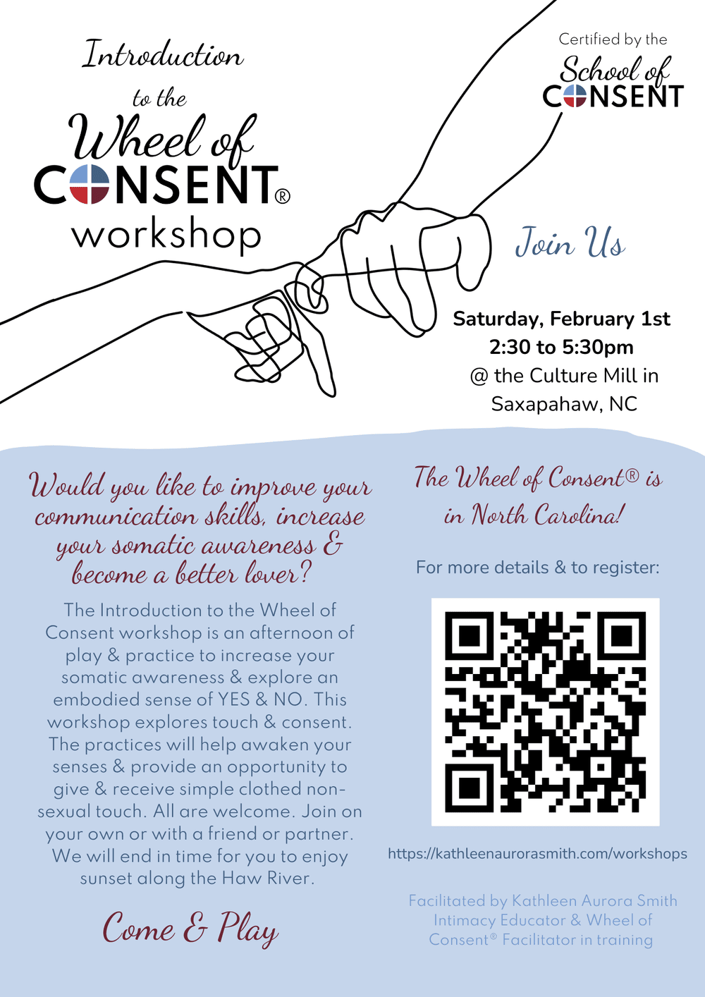 Join us for the weekend: April 25th & 26th, 10a-6pm in Saxapahaw, North Carolina for a deep dive into the Wheel of Consent ®